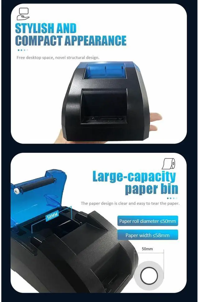 Compact And Stylish Design: With its trendy and compact appearance, this receipt printer saves valuable desk space. Its portability makes it ideal for carrying on the go. 5.