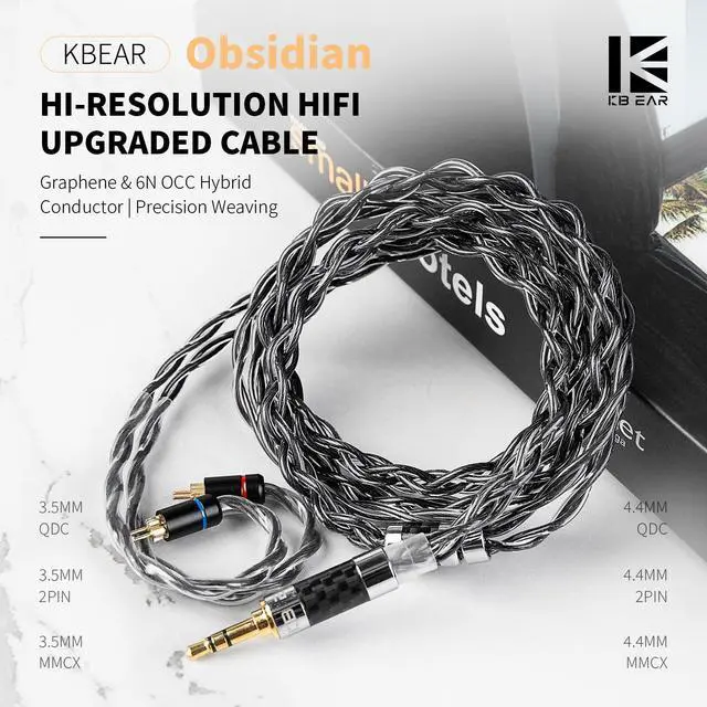 ^^ High-Quality MaterialKBEAR Obsidian Black high-resolution HiFi upgraded braided cable adopts 21AWG cross-braide precision structure, which enhancing anti-interference and flexibility for a more stable, cleaner signal path, thus highly restoring the details of the sound. The 4-strand 196-core high-density braiding process enhances the cable's tensile strength, effectively preventing tangling and knotting. And the plug, split, slider, pins, all of them are made of high-strength aircraft aluminum. ^^ Design for Mainstream HIFI in Ear EarphonesThe KBEAR Obsidian earphone upgraded cable is designed with several connectors to suit for most earphones.