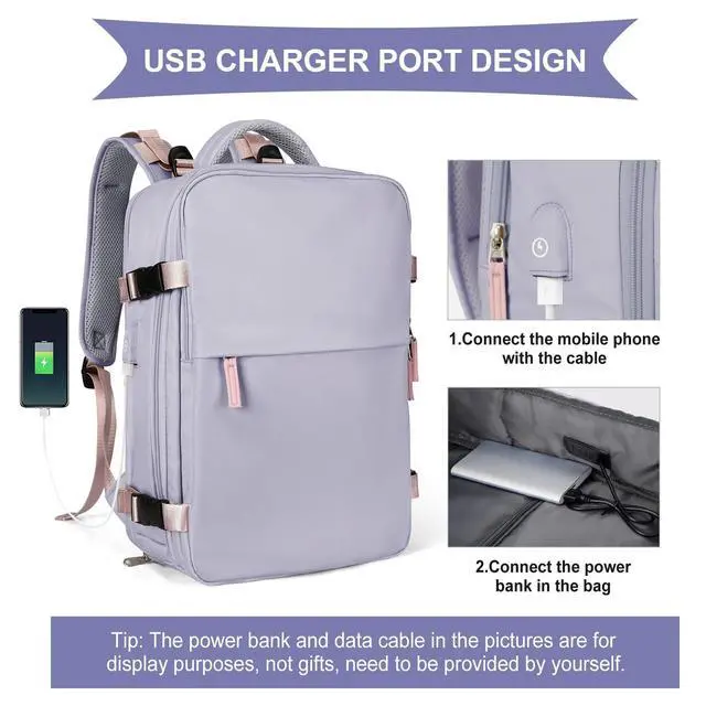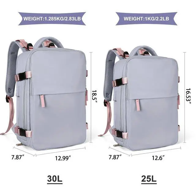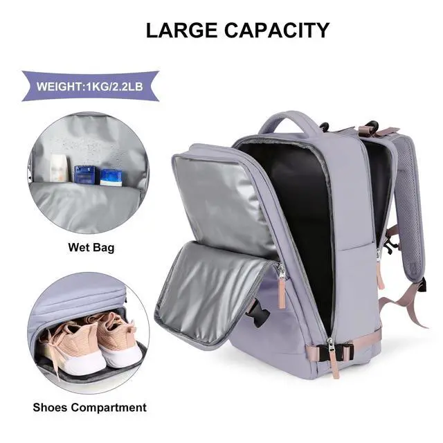 Large Upgraded Version Size: 30L. Increase capacity, improve comfort. ^^ Large Travel Backpack for womenThis backpack is made of waterproof durable polyester, good air permeability and heat dissipation with two padded shoulder straps, offers lightweight carrying and of force reinforcement, keeping cool when you carry it for a long time. And it is tough, firm and does not fade. ^^ Separate shoe compartment design and wet pocketMain pocket x 2, laptop compartment x 2, and many other pockets for different purposes. Wet bags are made of high-density waterproof material to help you separate wet and dry items, and if you have wet clothes or towels, you can put them in the wet bag. A separate shoe cabinet can help you better carry your shoes and store them in your travel bag. ^^ USB Charging PortBuilt-in charging port to charge your phone anytime, anywhere. ^^ Anti-theft Multifunctional BackpackThere is a zipper pocket on the back of the bag, which can store valuables such as mobile phones and iPads, which is anti-theft and convenient. Multifunctional DaypacksHybrid (Backpack/Duffle Bag/Shoulder Bag/Travel Bag) conversion. Can be used several different ways.