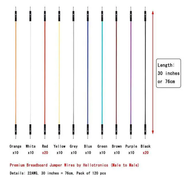Breadboard Jumper Wires by Hellotronics, 100-Pack, 10 ColorsNow with 20% More Red and Black Jumpers Male to Male Male to Female Female to FemaleComes in 22AWG wires diameter, 10 colors, total pack of 120 Jumpers. This is a Hellotronics exclusive! These are 4''/6''/12'' long jumper wires terminated as male to male, male to female and female to female. Use these to jumper from any male or female header on any board. Multiple jumpers can be connected next to one another on a 0.1 '' header. You can use these wires for everything! They work great with breadboarding projects.
