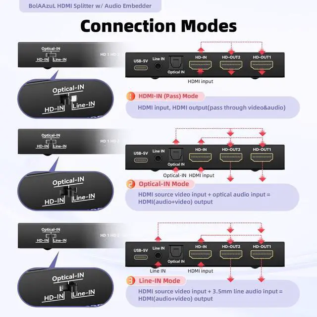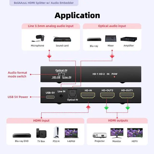 BolAAzuL HDMI 2.0 Splitter with Audio Embedder Inserter Digital Analog Audio, Support TOSLINK Optical 3.5 mm Jack AUX Sound Input 4K60Hz 18Gbps HDR HDCP 2.2T he 2-port HDMI splitter with Audio inserter can work as a 1X2 HDMI Splitter when you set the audio in to HD-IN. And it can also allow you to insert stereo audio signals either via the Toslink or analog 3.5 mm input to the HDMI out. The HDMI audio embedder is compliant with HDMI 2.0 and HDCP 2.2. It supports in and out resolutions up to 4K@60Hz.