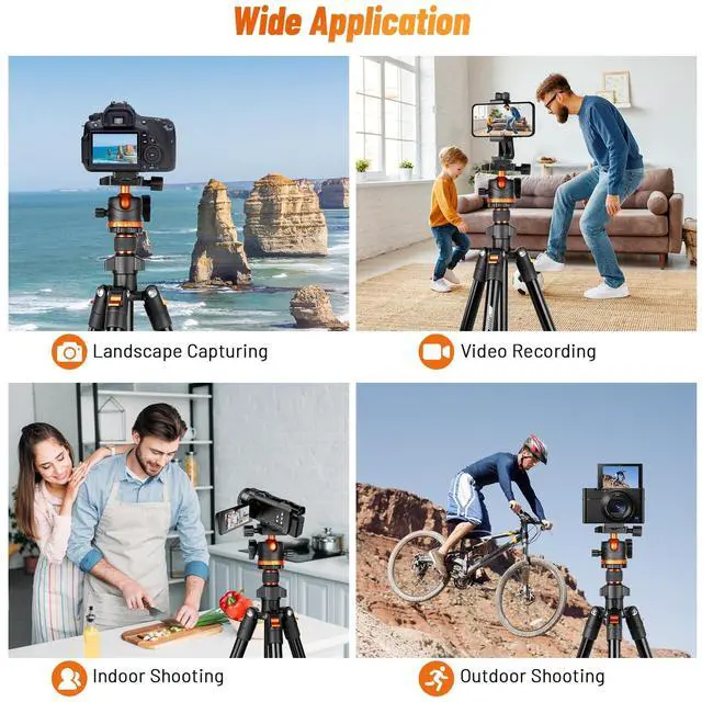 Camera: This professional camera tripod can adjust up to 66 inches while delivering rock-solid stability at every height setting. 3-angle adjustment leg locks adapt to slopes, marshland, and uneven terrain with slip-resistant rubber feet. The bottom hook secures counterweights (sandbags) to enhance wind resistance, Making it a reliable choice for outdoor photography and video recording.