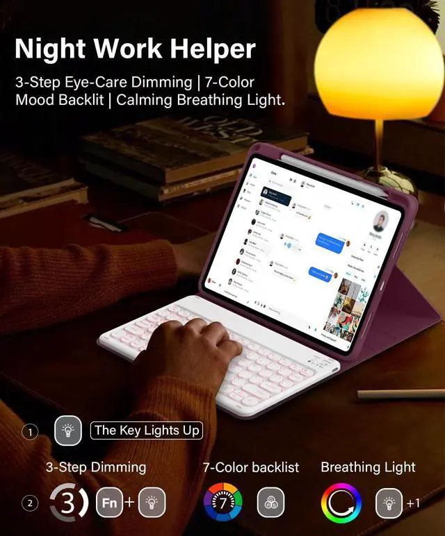 • Glow-Comfort Backlit7-color backlit with 3-step dimming (30%/60%/100%) eases eye strain. Enhanced by a dynamic breathing lightflowing gently as you type. This smart combo is ideal for iPad A16/10th gen users working late or studying in dim light. Gentle light, happier eyes.