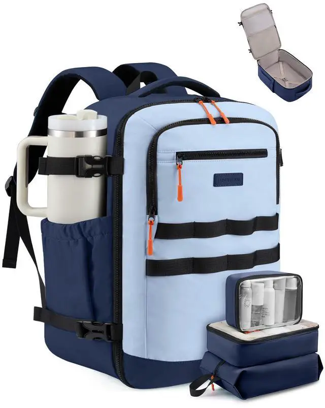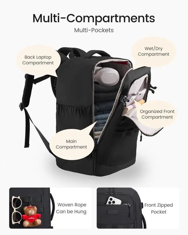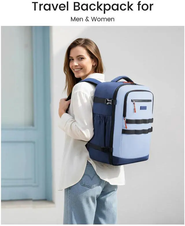 Packing Cubes & Dry-wet Separation: This carry on backpack Included a mesh packing cube that neatly store and aerate underwear and socks, plus a 42cm shoe bag that fits 12 pairs. The included a clear toiletry bag is TSA-compliant and waterproof, ensuring everything else stays dry. Everything has its placepacking and unpacking become effortless. ^^ Comfortable &