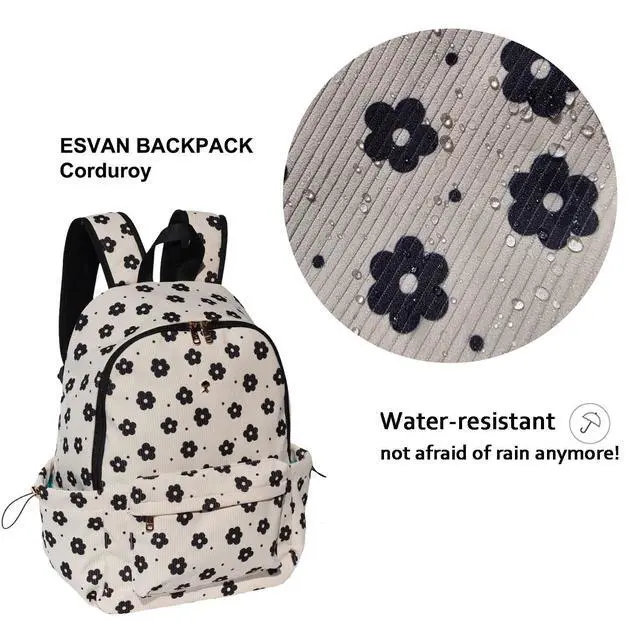 Stay organized effortlessly. ^^ Built to Last with Sustainable FabricCrafted from water-resistant corduroy and printed with eco-friendly methods, this backpack is also machine washable and sturdy enough to handle your everyday carry. Whether youre on the go or commuting, it serves as a reliable travel partner. ^^ Comfort-Focused Ergonomic DesignPadded, adjustable shoulder straps help balance the load to minimize shoulder pressure, ensuring comfort throughout the day. A reinforced top carry handle allows for easy lifting or hanging. Finished with a durable ESVAN zipper and a charming drawstring closure, this bag blends functionality with fashionable flair.