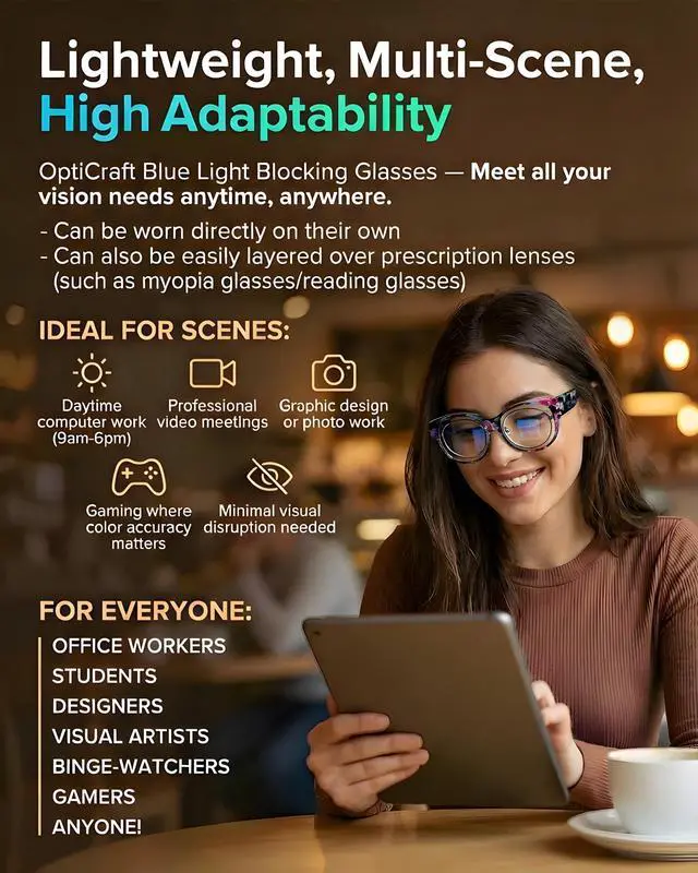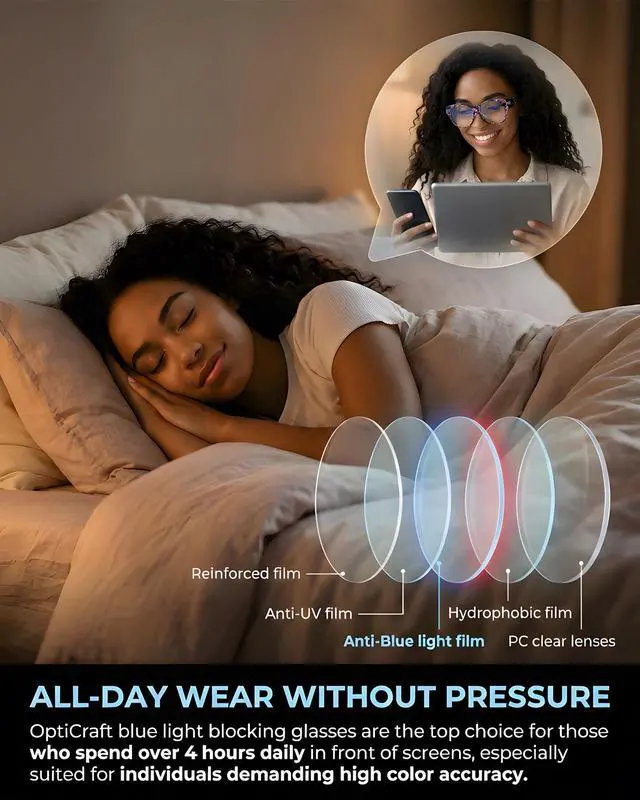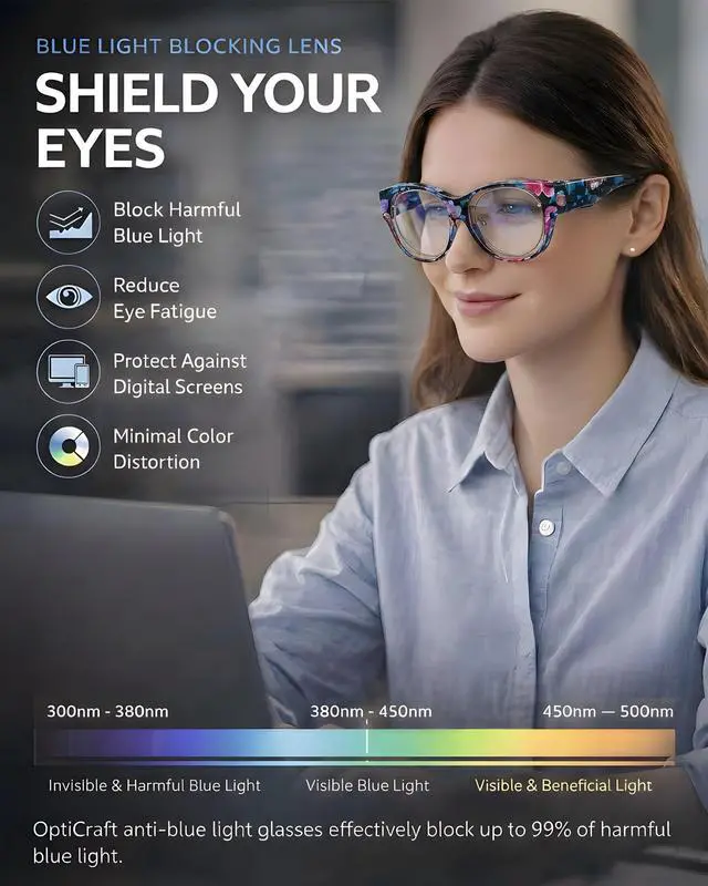 EFFECTIVE BLUE LIGHT BLOCKING: Equipped with advanced blue light filtering technology, OptiCraft anti-blue light lenses are specially engineered to block harmful blue ray from digital screenssuch as computers, smartphones, and tabletsmore effectively than standard lenses, helping reduce digital eye strain. ^^
