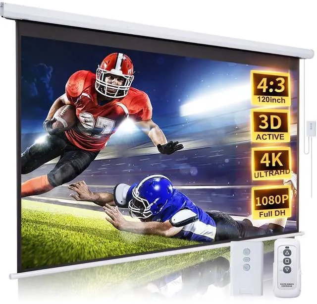PROJECTOR SCREEN MOTORIZED: The 120 inch projector screen has a 4:3 aspect ratio. The screen features a high gain of 1.2 and is compatible with 3D, 1080P, 4K, and full HD images, ensuring excellent color reproduction. It offers an immersive virtual scene that makes you feel as though you're in a virtual world, providing a completely new experience for you and your friends. ^^