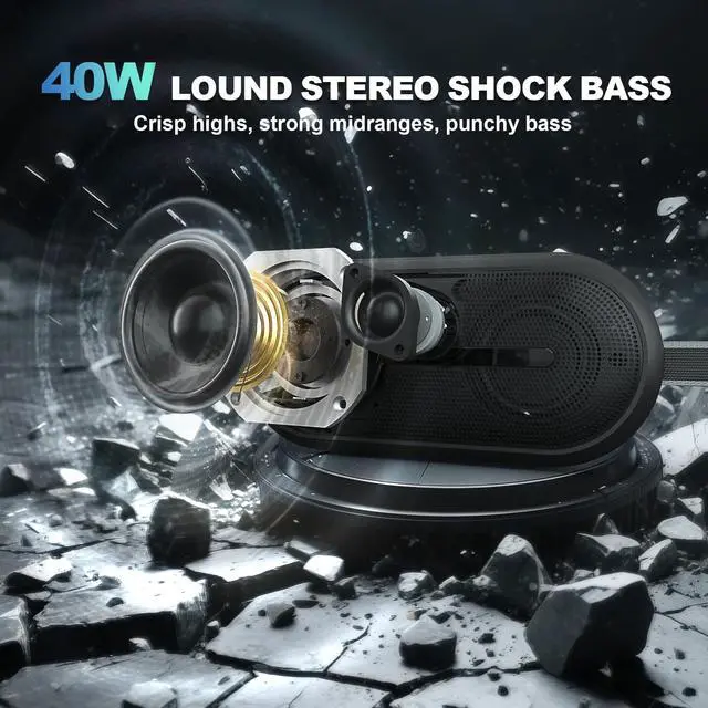 Deeper Sound: Equipped with bass-enhancing woofers and tweeter, our blue tooth speaker wireless delivers resonant lows, crystal-clear highs, and 40W bass-driven stereo sound for immersive music anywhere ^^