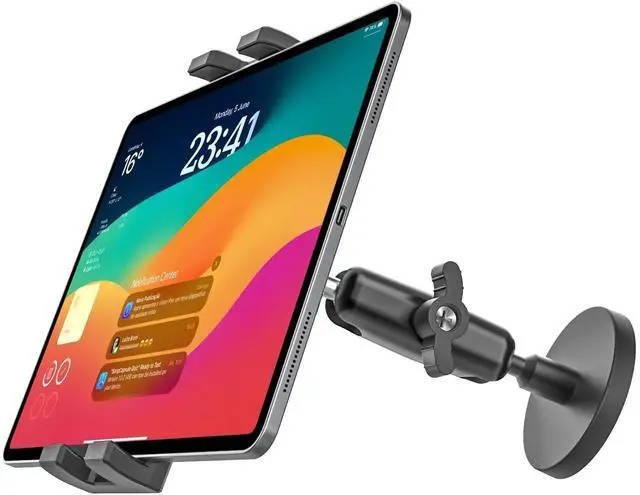 The strong metal ball heads resist wear and tear, providing lasting strength compared to fragile plastic mounts. ^^ Flexible 360 AdjustmentFeaturing a 4.92" arm with three durable metal ball joints, this magnetic iPad holder allows full 360 rotation and multi-angle adjustment. Effortlessly rotate between portrait and landscape viewing or tilt to your perfect angle, reducing neck strain and enhancing your hands-free experience. ^^ Safe & ProtectiveBoth the clamp and magnetic base are lined with soft silicone pads to prevent scratches, slipping, and vibrations. This thoughtful design protects your devices and the surfaces it attaches to, ensuring secure, safe use whether at home, in the car, or on the job site.
