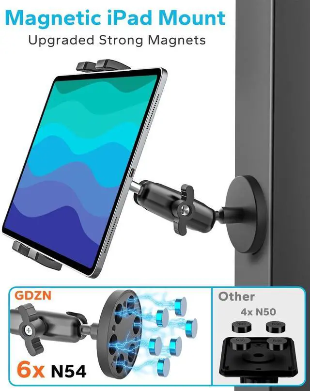 Super Magnetic BaseBuilt with 6 premium N52 magnets and a 2.6" magnetic base, this magnetic tablet holder delivers a powerful grip on refrigerators, cabinets, gym equipment, whiteboards, cars, trucks, forklifts, tractors, golf carts, boats, aircrafts, and more metal surfaces. The larger contact surface ensures stronger suction and stability, keeping your device securely in place on wider metal surfaces. ^^ Durable & Stable DesignConstructed with heavy duty metal arms and reinforced joints, the magnetic stand ensures long term durability and stable support without wobbling or sagging.