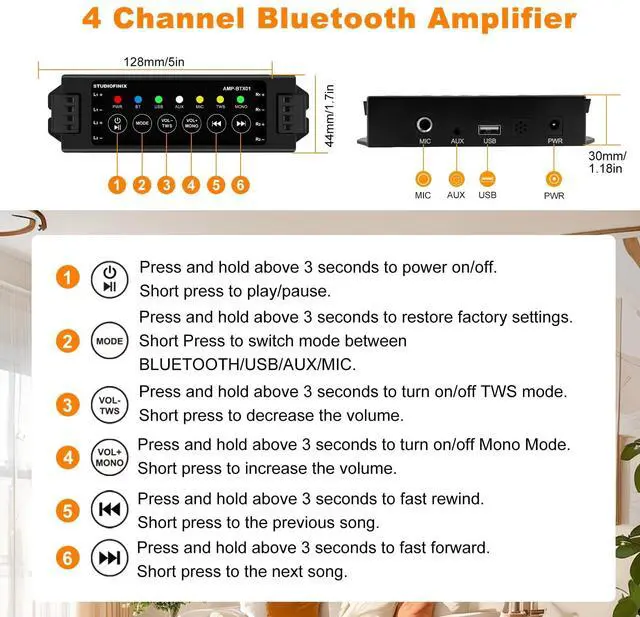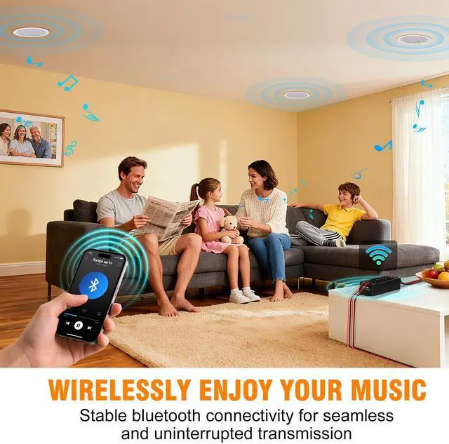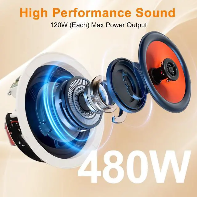 480W Peak High Power, Premium Full-Range Acoustic Ceiling SpeakersThis 4-speaker system delivers 480W total peak power (120W per speaker), engineered for distortion-free, room-filling sound. Built with high-sensitivity 4-inch woofers for deep, punchy bass and 1-inch tweeters for crisp, detailed highs, it reproduces full-range audio with stunning clarity. Perfect for whole-home audio, living rooms, kitchens, home theaters, and light commercial use. ^^ Upgraded Bluetooth 5.0 Multifunctional AmplifierOur 4-speaker system is equipped with an advanced Bluetooth 5.0 amplifier, delivering faster transmission, pristine sound with minimal quality loss, and longer effective working range.