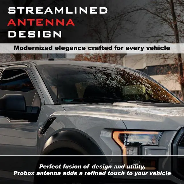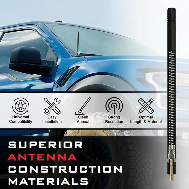 ^^ UNIVERSAL FIT FOR TRUCKS & SUVS Engineered for broad compatibility, this antenna includes multiple screw adapters to fit 98% of vehicles. It is a perfect replacement for Ford F-Series (F-150, F-250, F-350), Chevy Silverado, GMC Sierra, Dodge RAM 1500/2500, Toyota Tacoma & Tundra, Jeep Wrangler (JK, JL, Gladiator), and Nissan Titan. ^^ SLEEK LOW-PROFILE LOOK Upgrade your vehicles aesthetic instantly by replacing that long, ugly factory metal whip. At 8.5 inches, it offers the perfect balanceshort enough to look modern and clear garage doors, yet long enough to maintain excellent radio reception.