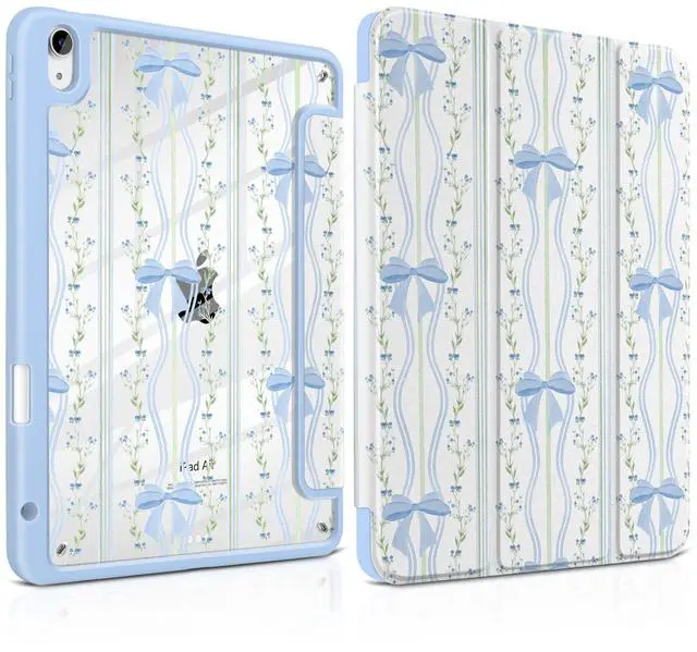 Two Viewing Modes: The magnetic trifold cover folds into stable viewing and typing angles, perfect for watching videos, working, drawing, or studying. ^^ Clear Acrylic Back with