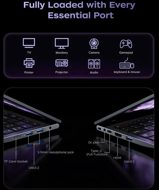 ^^ 1TB Large CapacityThis ryzen laptop computer comes with 16GB of DDR4 RAM and a 1TB M. 2 NVMe SSD, ensuring faster response times and ample storage for your files. The dual-channel DDR4 memory can be upgraded to 64GB (2x32GB), while the NVMe/NGFF SSD supports expansion up to 2TB. With this level of upgradeability, you'll have more than enough space to store all your favorite videos/files and handle even the most demanding tasks with ease. ^^ Extensive & Premium ConnectivityDesigned for ultra-fast running, KAIGERR AMD Ryzen 7 Laptop is equipped with webcam 1, USB 3.2 2, HDMI 1, Type_C (full function) 1, 3.5 mm audio/microphone 1, TF card holder 1, Type_C DC jack 1.