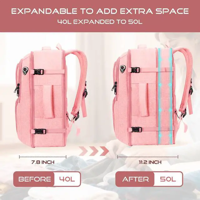 Expandable Capacity: This travel backpack features additional expandability. Simply unzip the backpack to expand its capacity and gain more storage space. Expanding the backpack increases its thickness by 3.35 inches, increasing the capacity to 50 liters, enough to accommodate a 17.3 -inch laptop and easily carry 3 to 5 days' worth of travel essentials.