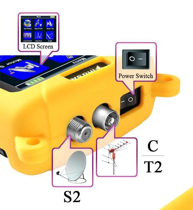 Test Content: Signal Strength, Quality, BER, PWR, SNR, MER etc; LNB short-circuit protection and indicato ^^ Can support power for 0V/5V/12-T/T2 antenna; Support low-voltage charging, can automatically wake up the sleep Battery; Audio alarm indicates signal intensity levelo