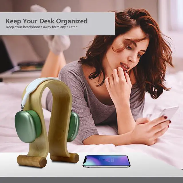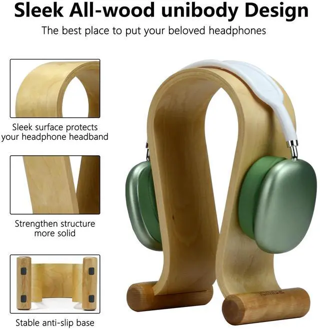 Sturdy and ElegantThis wireless headphone stand is made of high-quality birch wood, one-piece design, no assembly required. The Omega exterior design provides a safe and stable foundation for your headphones. ^^ Multi-Scenario UseThis wood headphone stand great for desk, TV cabinetmm, home, office, recording studio, bedroom or next to your computer. ^^ Wide Compatible Wooden headphone stand fits most headphones with a headband width within 5.7I n/ 14.5 cm and device height within 10.23I n/ 26cm. ^^ Protect Headphone The part of this headphone holder where the headphone is placed is curved.