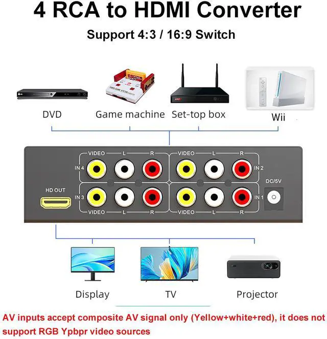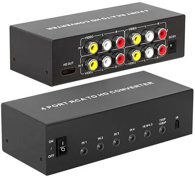 Resolution: The 4 in 1 out converter is an 4 AV input to 1 HDMI output scaler converter. It is designed to up-scale 4 Composite (RCA) /analog input to HDMI 720P/1080P output ^^ 4:3 / 16:9