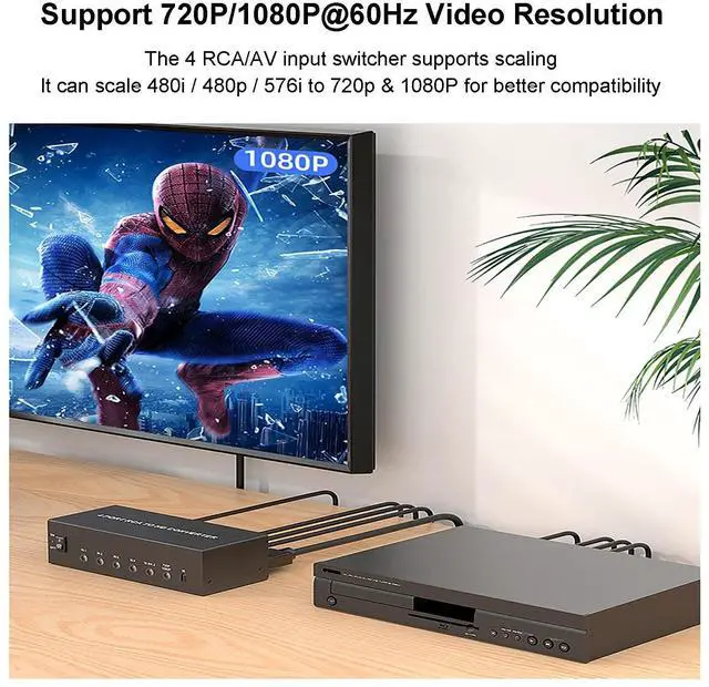 Switching Method: The AV HDMI adapter features with remote control and button control. It's easily switch between 4 RCA devices at any time