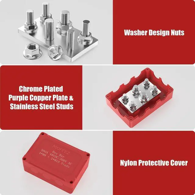 Its nylon bottom is firmly held by M8 posts which makes more fixed and won't strip ^^ Built for SafeOur battery terminal distribution block is covered with flame-retardant nylon which provides an layer of protection and prevents metal components from making contact with anything. The 10 removable circular covers make it easy to pass wires terminals through and prevent short circuits ^^ Versatile ApplicationMofeez battery busbar is a top-quality circuit collection wire harness that is ideal for use in cars, RVs, yachts, caravans, and ship power systems. It securely holds wide cables and helps to keep wires organized and neat
