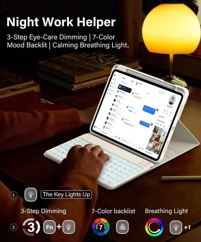• Glow-Comfort Backlit7-color backlit with 3-step dimming (30%/60%/100%) eases eye strain. Enhanced by a dynamic breathing lightflowing gently as you type. This smart combo is ideal for iPad Air 10.9" 4th/5th Gen users working late or studying in dim light. Gentle light, happier eyes.