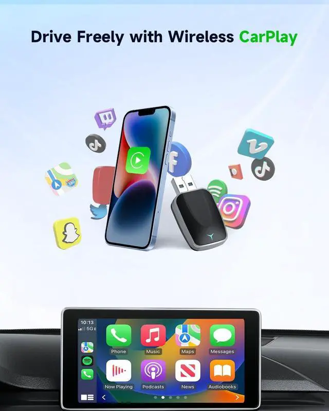 Wireless CarPlay & Android Auto AdapterUpgrade your driving experience with our latest 2-in-1 wireless adapter! Effortlessly convert your vehicles original wired CarPlay/Android Auto system into a wireless connection and say goodbye to messy cables. Enjoy music, make calls, use navigation, mirror your phone, and interact with Siri hands-free. ^^ Stable & Lightning-Fast ConnectionEquipped with a dual-band 2.4GH z & 5GHz chipset and advanced Bluetooth 5.0 technology, the wireless carplay adapter ensures real-time navigation, crystal-clear audio, and smooth touchscreen response at all times. Say goodbye to lag and connection drops.