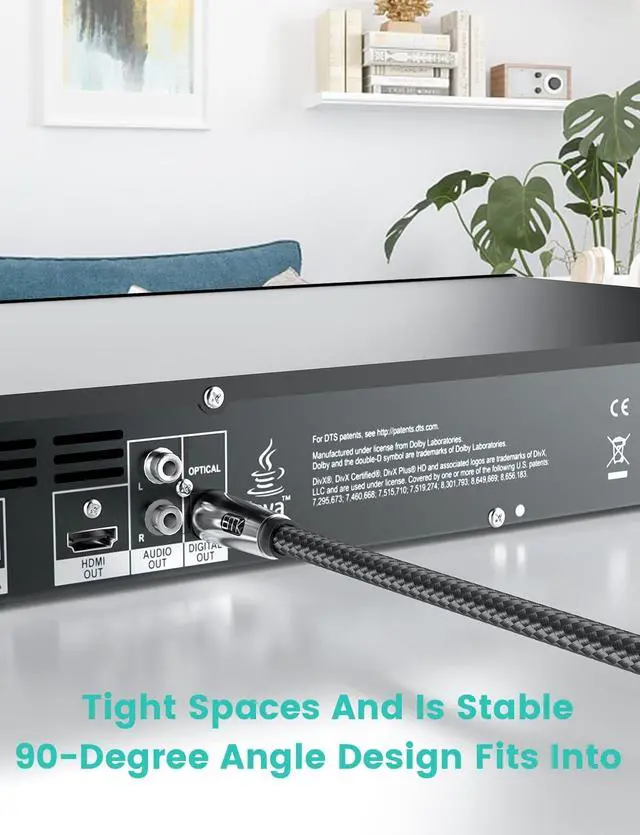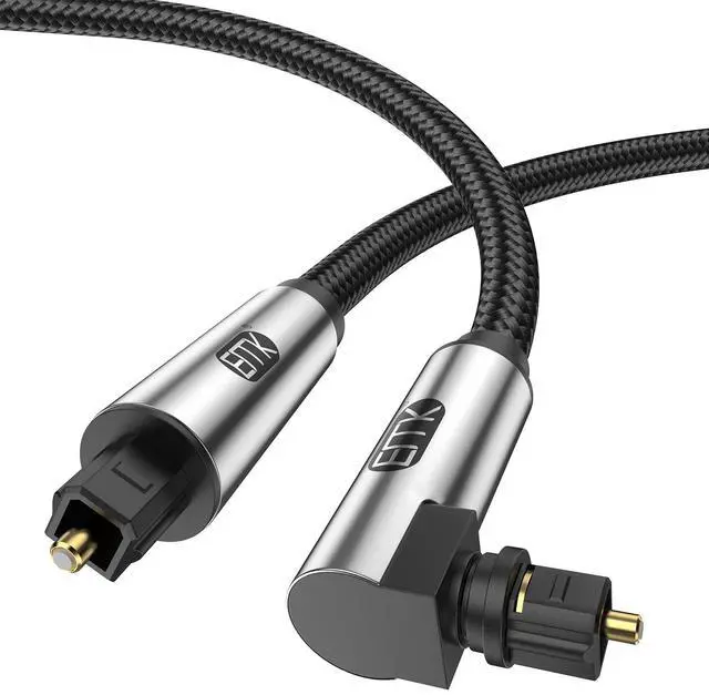 [Space-Conserving Design]Unique right angle design makes the optical audio cable a better fit for wall-mounted devices, solving the embarrassment of limited spaces between wall and device. ^^ [Superior Sound Transmission]Utilizing light to transmit sound, our Toslink optical cable avoids electromagnetic interference, delivering pristine audio quality for your home theater system, gaming consoles, and more. ^^ [Top-Quality Fiber Core]Featuring a premium fiber core from Japans Toray Industries, this cable provides zero-distortion digital audio streams, making it the perfect choice for uncompressed PCM audio and compressed 5.1 to 7.1 surround sound systems (Dolby Digital Plus and DTS-HD).