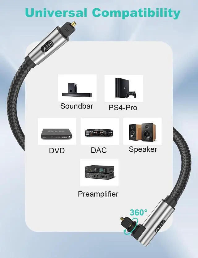 ^^ [Durable and Flexible] Constructed with a cotton-braided jacket, this optical cable is ten times more durable than conventional plastic cables, offering enhanced flexibility and longevity for your digital audio needs. ^^ [Universal Compatibility]The optical audio cable connects audio components from Blu-ray players, projectors, gaming console, televisions, DVD players, and more. It fits standard Toslink (S/PDIF, Optical) ports.
