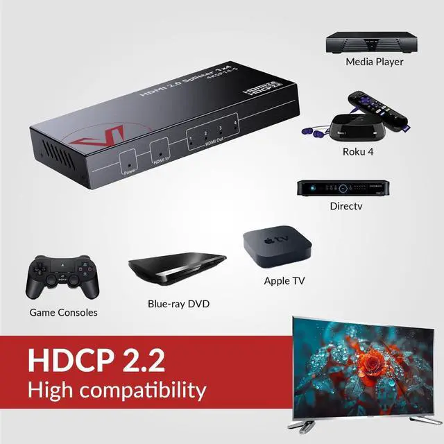 [@/@ 4 ] Supports resolution up to 4K@60Hz (YUV 4:4: 4) with 3D effect. Supports lossless audio formats such as Atmos, DTS: X, DTS-HD Master Audio, TrueHD. It distributes one HDMI signal to four Ultra-HD displays simultaneously at 18Gbps bandwidth, fast and stable. It bypasses 4K HDR Atmos signal when the 4K TV supports. ^^ [ ] HDMI 2.0 Splitter supports auto downscalilng and EDID. When 1080P display is connected with 4K display, the HDMI output automatically downscales 4K to 1080P for the 1080P display while the 4K display still having 4K signal. Which means it automatically select the most suitable resolution for displays. ^^ [ ] A. Resolution downscaling from 4K2K@60Hz ( 4:2: 2) to 1080P is not supported; B. Cable Recommendation, 1080P@60hz