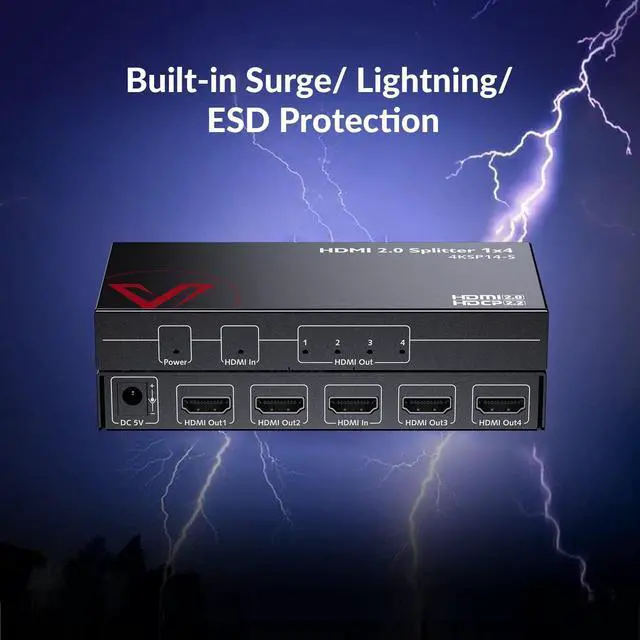 8bit input/output: 5m cable. C. When extracting HDMI 2.0 audio, please connect TV and AV Receiver to extract audio into optical / RCA out. ^^ [ ] 4K Splitter compatible with all standard HDMI devices with any operating system, such as Windows 10/8/ 8.1 /7/Vista/XP and Mac OS X, Linux and Chrome OS. It works perfect with PS4 Pro, Xbox one X, Roku, Apple etc. ^^ [ -] With built-in Surge/Lightning protection and superior ESD protection to prevent thunder strikes. 3 Year Warranty, and we can be reached by seller page or email print on the manual.