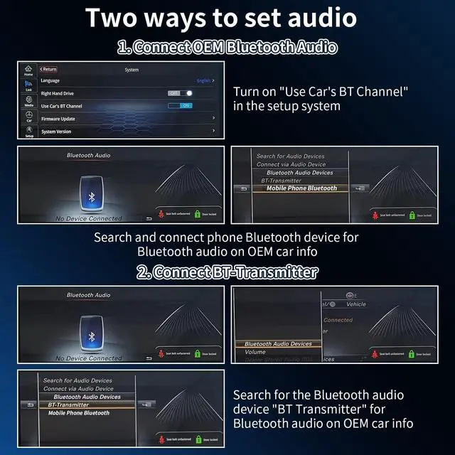 Audio: 1. Connect the Bluetooth audio device "BT-Transmitter" via OEM car system. 2. Turn on "Use Car's BT Channel" in the settup, find your phone's Bluetooth in OEM car systems Bluetooth audio device list, then pairing OEM Car Bluetooth with your phone. ^^ High-resolution Full-color DisplayThis product is equipped with a 12.3 -inch high-definition touch screen, 1920*720 high-definition resolution, and a wider color display, providing a clearer and more delicate viewing effect, greatly improving the visual experience. The screen supports high-definition 1080P video playback. ^^ Mirror Link Function Supports Air-Play and Android Mirror-Link, you can enjoy a cinema-level entertainment experience through smartphone videos. The automatic light sensitivity adjustment function intelligently switches between daytime and night modes according to the brightness of the vehicle's headlights to ensure comfortable visual effects under various light conditions. ^^ BARGGN ServiceIf you encounter any issues related to Compatibility, Audio, Installation, Wireless Connectivity or other problems, please reach out to us. We will provide technical assistance.