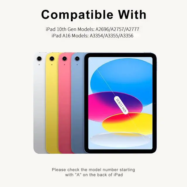 Note: Not be compatible with any other model of iPad. Before purchasing, please check the model number "AXXXX" on the bottom of the back of the iPad to confirm if the size of the iPad is correct ^^ Detachable Bluetooth KeyboardThis iPad 11th/10th gen case with keyboard supports bluetooth connection to your iPad 11th/10th generation without the need for extra cable devices, providing you with ultimate convenience. The iPad 11/10 case keyboard has a quiet and smooth touch, providing you with a comfortable typing experience. Improve productivity while browsing web pages, editing documents, transferring videos, and more, turning your 11 inch/ 10.9 inch iPad into a laptop in seconds ^^ Powerful Battery and Auto Wake SleepThe iPad case 11th/10th generations keyboard is equipped with a powerful battery, energy-saving mode, and only takes 2-3 hours to fully charge. When you open or close this 11inch/ 10.9 inch iPad case 11th/10th generation, it will automatically wake up or hibernate the iPad, which helps to extend the battery life of the iPad ^^ High Quality Shell and Precise Cutting DesignOur iPad 11th (A16) generation/ 10th generation case with keyboard features a high-quality PU leather outer shell and a soft ultra-fine fiber lining inside, full protect your iPad 11th/10th generation from various drops.