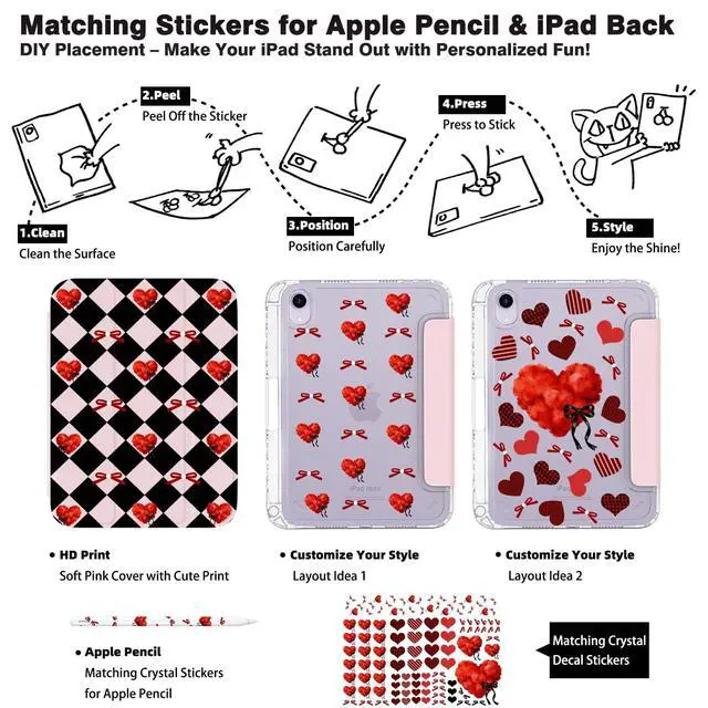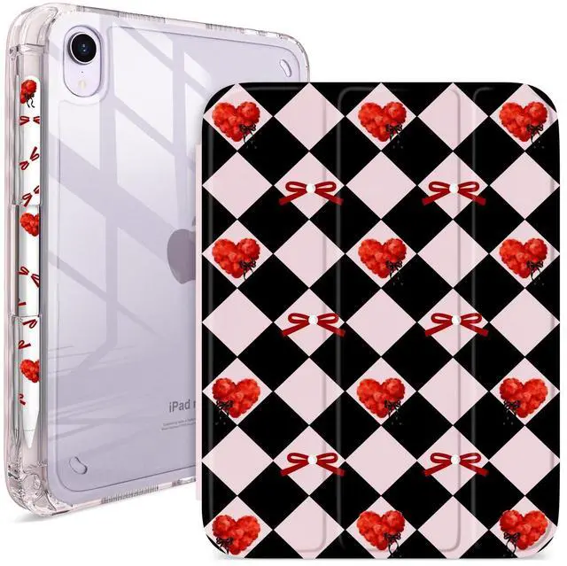 Perfect Fit for iPad Mini 6/7 No More Guesswork! Exclusively designed for 2024 iPad Mini 7 ( 8.3 -inch, A17 Pro, Models: A2993/A2995/A2996) & 2021 iPad Mini 6 ( 8.3 -inch, Models: A2567/A2568/A2569). NOT compatible with other iPads check the "Axxxx" model number on your tablets bottom before buying. Precise cutouts ensure seamless access to all buttons and ports, hassle-free. ^^ Cute Bowtie Heart Checkerboard Design Sweet & Edgy Vibe Features a charming bowtie and heart pattern on a black-pink checkerboard backdrop, tailored for women and girls who love cute-yet-edgy tech accessories. The clear case showcases your iPads original look while resisting yellowing over time. Its a statement piece that adds a pop of sweetness to your daily routine, whether in class, at coffee runs, or on your social media grid. ^^ 2-Angle Trifold Stand Hands-Free for Every Moment Innovative trifold stand supports 65 for streaming, reading, or video calls, and 30 for note-taking, essay writing, or on-the-go work. Stay productive and comfortable without holding your iPad all day ideal for busy students and fashion-savvy trendsetters. ^^ 360 Shockproof Protection + Bowtie-Heart Pencil Holder Crafted from premium shock-absorbing clear material, this case fully shields your iPad from drops, bumps, and scratches. The built-in pencil holder (styled to match the bowtie-heart theme) keeps your Apple Pencil secure and supports wireless charging.