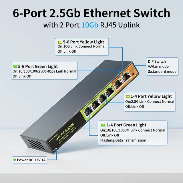 Build a faster, more stable, and future-proof network with ease. ^^ Multi-Gigabit with Auto-Negotiation All ports with auto MDI/MDIX for hassle-free connectivity, ports 1-4 support 2.5G /1G/100Mbps speeds, while ports 5-6 offer flexibility with 10G/5G/ 2.5G /1G/100Mbps. Unlock the full potential of your network with our versatile 6-port switch, designed for todays high-bandwidth demands. ^^ Blazing-Fast PerformanceExperience a dramatic speed boost with performance that is 2.5 times faster than standard Gigabit switches. Powered by a robust 60Gbps switching capacity, this switch effortlessly handles heavy data traffic and bandwidth-intensive tasks.