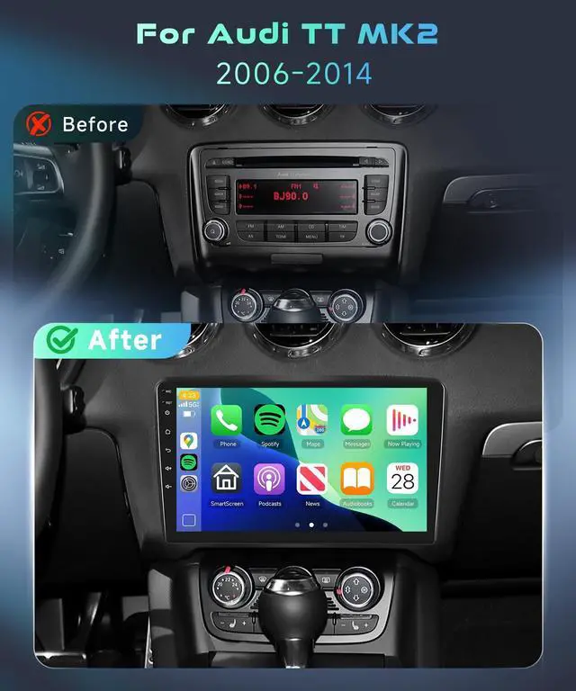 Android 13 Car Stereo with Qualcomm's Chip This Android car stereo Compatible with Audi TT MK2 (8J) 2006 2007 2008 2009 2010 2011 2012 2013 2014 Radio. Featuring the Android 13 system, an Qualcomm's 8-core chip, 4GB RAM, and 64GB ROM for smooth performance.!!!!
