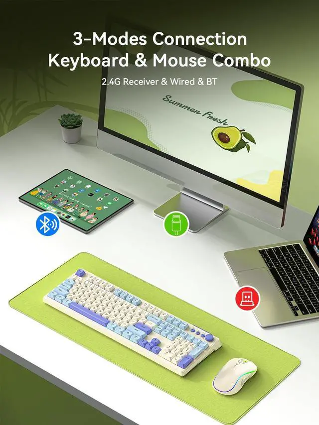 Full Size Keyboard, Plug and Play with It104 Keys Full Size Keyboard. Featuring standard keyboard layout with F-keys ( function keys ) and number pad. Floating keycaps are removable and feel good in the hand. keyboard and mouse combo with RGB backlighting. It features 2.4G mode, Bluetooth, and wired mode functionality.