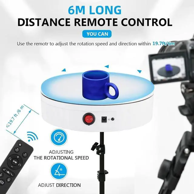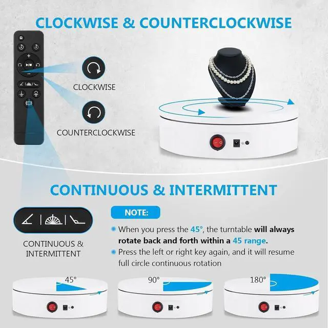 MAX LOAD-BEARING IN THE SAME MODEL - Compared to others with only 176lbs load capacity, our 11.8 '' high-quality rotating display stand can easily bear objects up to 220 lbs/100 kg. Geart for larger items and even an adult model. ^^ CAN TURN ONLY 1 - You can make the motorized turntable turn 45/90/180, to get just the right angle shot. Besides, it is amazing for doing the slightest angle adjustments, the lowest 1 degree setting is barely noticeable by eye but you could pick it up in camera. Great for fine-tuning of shooting products! ^^ MULTIPLE ROTATION SPEEDS AND DIRECTIONS - You can remotely adjusting the rotation speed and direction by remote control under 19.7 ft/6m.