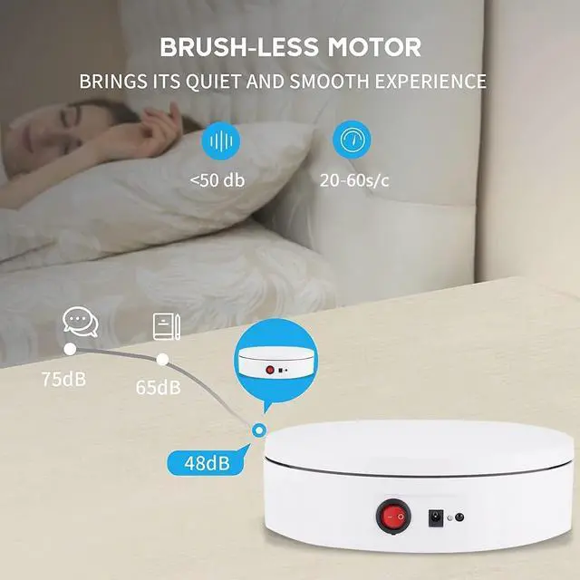 Electric turntable can do counterclockwise or clockwise rotation, do continuous or intermittent rotation. Great for captivating video shots of inanimate or boring items! ^^ HELP YOUR EXHIBITS STAND OUT - This rotating display can easily withstand the weight within 220LB/100kg, used for 360 degree images, short video, jewelry, 3d models, shoes, cosmetics, exhibition and other product display. Also comes with five top two-sided color plate (Matte on one side, glossy on the other) to match your exhibit colors. ^^ MINUES THE NOISE - The display turntable relates to a smooth motor with low noise <50 dB, won't bother people working or your video shooting.
