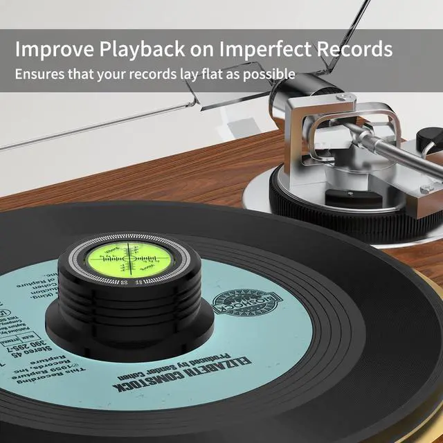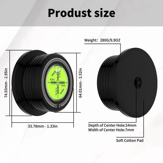 All-in-one Turntable Tool- The Viborg LP628B Record Weight Stabilizer not only removes additional noise introduced by dampening surface and bubble level, but also helps keep the record flush. Quality machining of aluminum and an attractive black finish make it a sleek addition to any turntable setup. ^^ Precision Leveling- The bubble in the center of the Viborg LP628B Turntable Level helps with precise leveling of the turntable, ensuring optimal sound quality. ^^ Improved Sound Quality- With the ability to eliminate vibration, feedback rumble, and other unwanted sounds, the Viborg LP628B Record Weight Disc Stabilizer helps produce a cleaner, clearer sound for your vinyl collection.