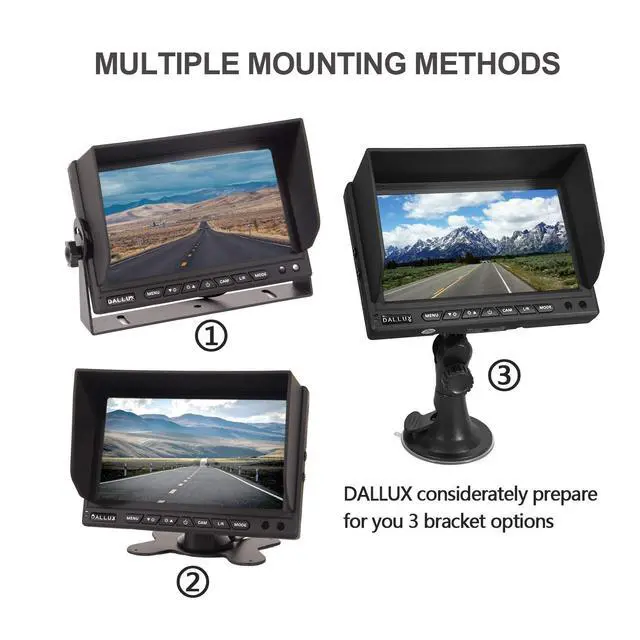 Backup Camera is 1/3" CCD 800 TVL, it can give you real nature color image without color deviation, completely waterproof with an IP69K rating. This is actually the highest IP rating there is and means the camera will work fine in all weather conditions. ^^ Three mounting methods to install the monitor, mount to the windscreen by using a suction bracket, or install it on the dash board by using Butterfly-shaped bracket or U-shaped bracket. ^^ With 18 infra-red lights, the backup camera will be able to see up to 50ft even in complete darkness! This night vision will be even without any ambient light at all.