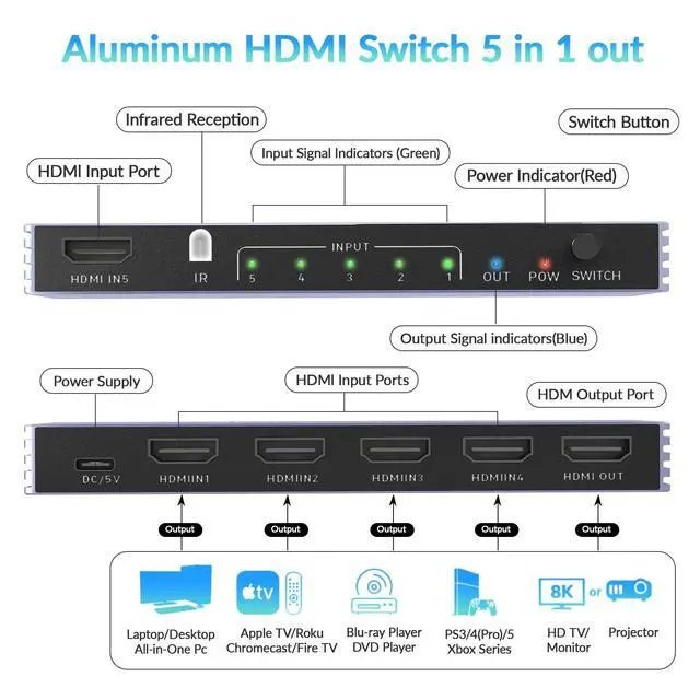 Seamless Connectivity: This 5 in 1 out hdmi switch efficiently connects up to five HDMI devices like your PS5, Xbox, Nintendo Switch, or streaming sticks to a single display. As a flexible hdmi splitter with remote, it eliminates constant cable swapping. Switch effortlessly between gaming, movie, or presentation modes using the included remote or manual buttons, with clear LED indicators showing the active source. This 8k hdmi switch 5 in 1 out is the ideal hub for your home entertainment or office setup. ^^ Stunning 8K/4K 240Hz