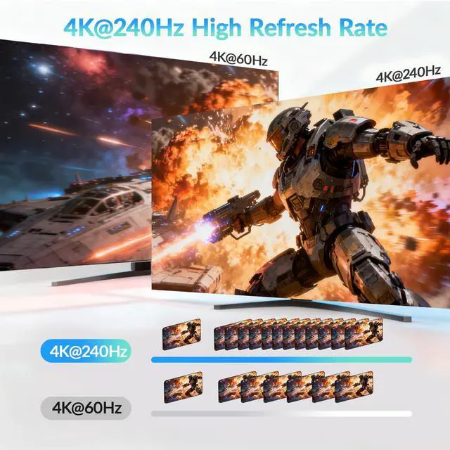 HDMI Splitter Visual: Experience the pinnacle of clarity and smoothness. This advanced 8k hdmi switch supports breathtaking 8K@60Hz/4K@240Hz resolution. For competitive gamers, it functions as a powerful 4k 240hz hdmi switch, ensuring ultra-smooth, tear-free gameplay. It's fully compatible with 8k hdmi splitter specifications, supporting VRR, HDR10+, Dolby Atmos, and 3D for a truly immersive experience. (For best performance, ensure your source, display, and cables support HDMI 2.1 ). ^^ High-Speed HDMI 2.1 Switch