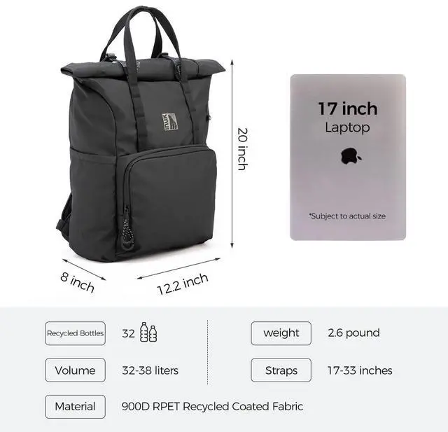 38L LARGE CAPACITY & MULTI-COMPARTMENT ORGANIZATION This 38L travel backpack offers expansive storage as a weekend backpack or carry on backpack. It features a dedicated double laptop compartment for a 17 inch laptop and a tablet, a rear quick access panel for your passport or boarding pass, and two side water bottle pockets. Multiple interior organizers keep tech gear, clothes, and essentials neatly separated and accessible. ^^ ECO FRIENDLY & DURABLE RECYCLED MATERIAL CONSTRUCTION Built sustainably with high density 900D RPET fabric, a water resistant, tear resistant, and lightweight recycled material made from 32 recycled plastic bottles.