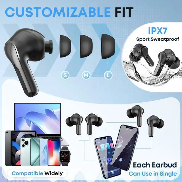 ^^ Ergonomic & Lightweight Design for All-Day ComfortDesigned for lasting wear, these earbuds feature an ultra-lightweight build and come with three sizes of soft, flexible ear tips to ensure a personalized and secure fit for virtually every ear shape. The ergonomic contour naturally aligns with your ear structure, minimizing pressure and fatigue whether you're working long hours, powering through workouts, or relaxing at home. ^^ IPX7 Waterproof for Your Diverse LifeFeaturing an IPX7 waterproof rating, these earbuds are designed to withstand sweat, light rain, and everyday moisture exposure, making them suitable for workouts, commutes, and outdoor activities.