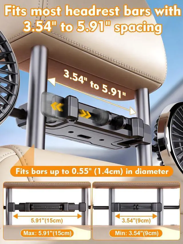Easy to Install: just hook the spring clamp onto one headrest post, stretch it to the opposite post and plug it into any USB port in your vehicle. The cooling fans stretchable clamp adjusts from 3.54" to 5.9". We recommend measuring your headrest posts before purchase. Its slimmer clamp fits narrow headrest bars, making it compatible with even more car models ^^ DUAL FAN HEADS, DOUBLE THE COOLNESSStay perfectly cool with our dual car seat fan headseach operated by its own button for independent control. Use one or both fans, and easily adjust their speed to match your comfort level. Twin fans work together to maximize airflow, keeping you refreshed even on the hottest drives. For optimal performance, use a 5V/2A (10W) or higher power source.