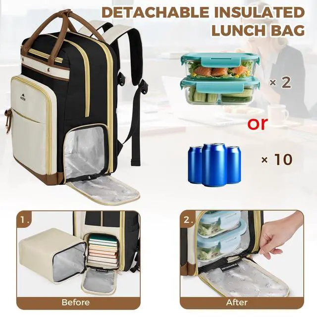 Detachable Lunch Compartment: Teacher bag with lunch compartment features an 2-in-1 Innovative design, equipped with a detachable lunch bag that can be used as both a lunch backpack and a laptop backpack. Main compartment of lunchbox backpack can be adjusted to fit your lunch container when needed, and the insulated lunch compartment can be detachable when not in use, easily converted into additional 1/3 storage space. Tailored for busy adults like teacher, nurse, office worker ^^