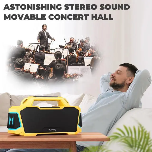 Powerful Stereo with Deep Bass Enjoy crystal-clear highs and punchy lows with the MusiBaby M1 portable Bluetooth speaker. Equipped with a built-in subwoofer, it delivers rich stereo sound and deep bass that make your music come alive indoors or outdoors. ^^ Upgraded Bluetooth 5.3 & Dual Pairing Seamlessly connect to your devices with stable Bluetooth 5.3 technology. Pair two M1 speakers together for immersive surround sound, perfect for parties, camping, or family gatherings. ^^ IPX6 Waterproof & Outdoor Ready Designed to handle splashes, rain, and even accidental spills, this waterproof speaker is ideal for outdoor use.