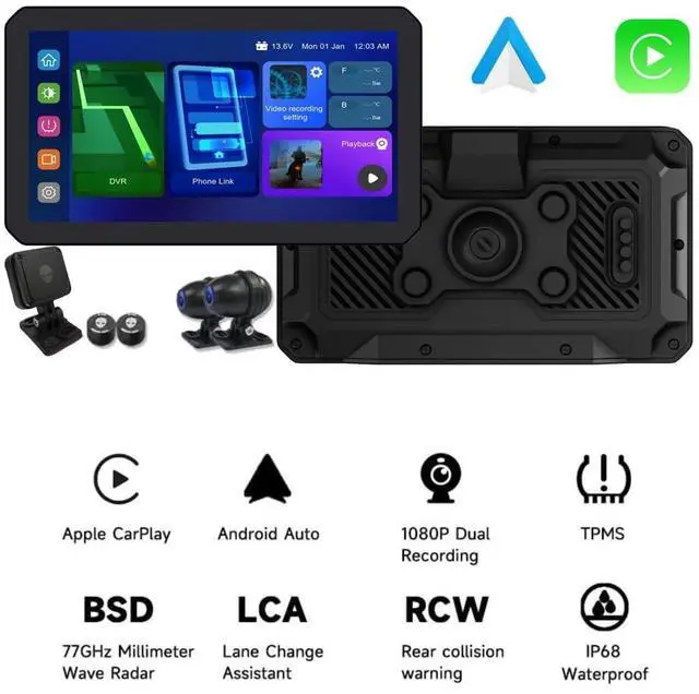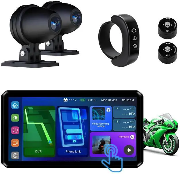 ^^ High-Quality Driving Recording and Streaming Rearview Assistance Supports 1080P video recording and night vision for clear footage around the clock. The rearview streaming lane-change assistance system helps eliminate blind spots in the rearview mirror, ensuring safe driving. ^^ Real-Time Tire Pressure and Temperature Monitoring Provides comprehensive tire pressure and temperature monitoring functions, displaying tire data in real-time and alerting you in case of abnormalities to ensure driving safety. Multi-tire display is supported, making it suitable for motorcycles and various vehicle types. ^^ Ultra-High Brightness Display and Waterproof Design Equipped with a 1200 nit high-brightness IPS touchscreen, it ensures clear display even under direct sunlight.