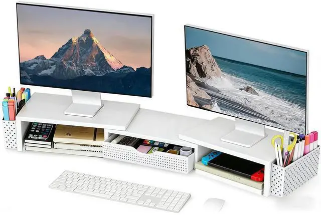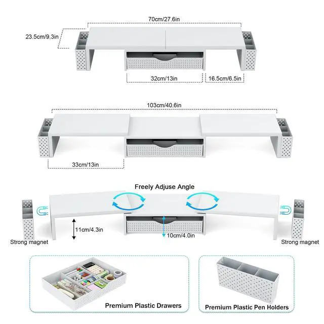 Dual-screen office efficiency improvement: This desktop organizer is equipped with a dual-display stand, which can place two monitors at the same time, effectively expanding the workspace. It also has adjustable length ( 27.6 - 40.6 inches) and angle to provide you with a better viewing experience.