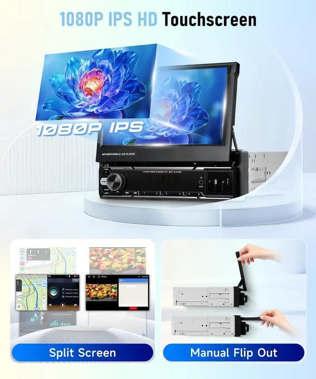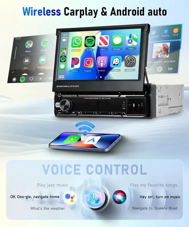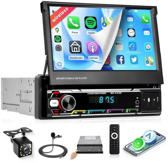 7inch Single Din Car Stereo Head Unit This single din car stereo supports wireless carplay and android auto, AM/RDS/FM radio, built in EQ for customized sound effects. Flip-out head unit features USB/AUX/U Disk interfaces and 7 colorful lights. Before purchasing, please check the size compatibility with your car console. Feel-free to send message to us if you have any questions ^^ Wireless Carplay & Android Auto This single din radio supports Wireless Carplay and Android Auto via bluetooth connection. On the 7-inch single din touch screen, you can enjoy a variety of mobile apps like Waze, Spotify, YouTube Music, News, etc.